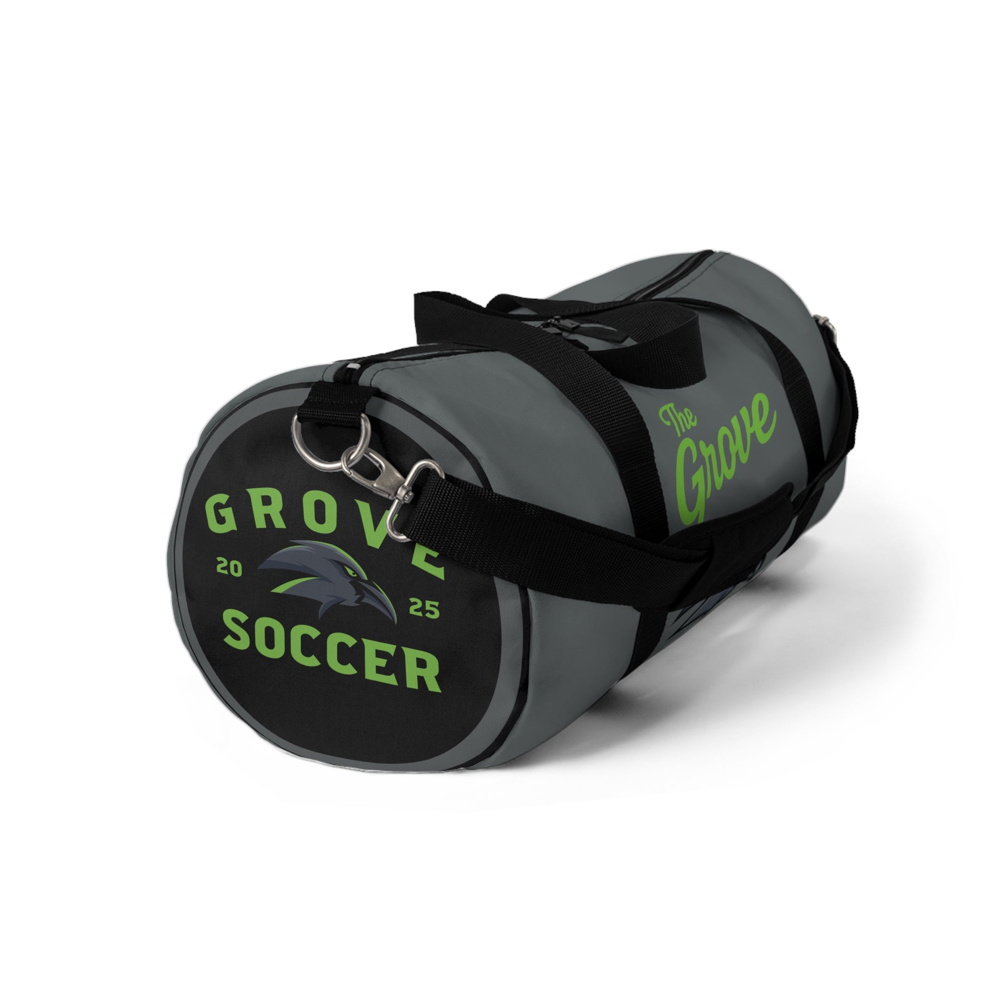A compact, tough duffel built to carry the week’s gear and tell your story. The muted gray canvas is stamped with a bold team-style crest and the lively lime script “The Grove,” so your bag stands out without shouting. Zip into a roomy main compartment, tuck valuables into the internal zip pocket with sewn name tag, or slip a water bottle into the exterior mesh pocket. Carry it by short handles or sling the adjustable shoulder strap over your shoulder for hands-free runs to practice, early-morning gym sessions, or quick overnight trips. Durable polyester holds its shape and dries fast, so this duffel ages with you through rain-soaked commutes and sweaty workouts while keeping everything organized and ready.